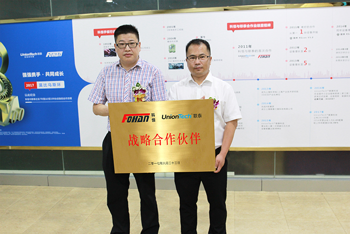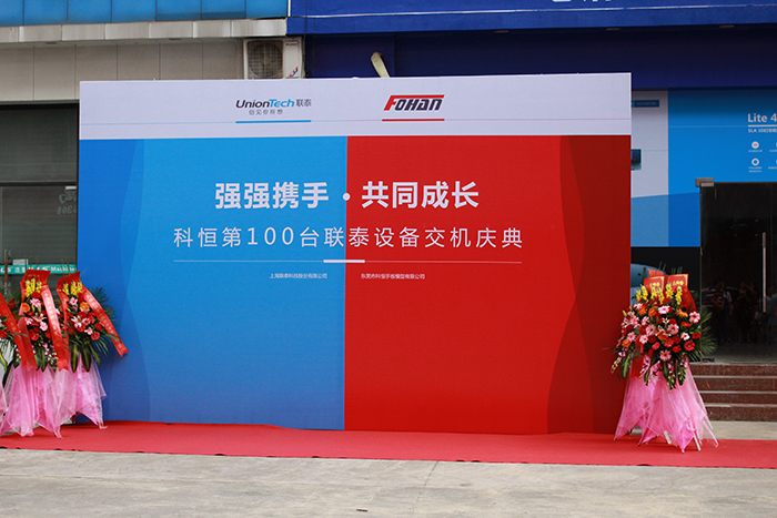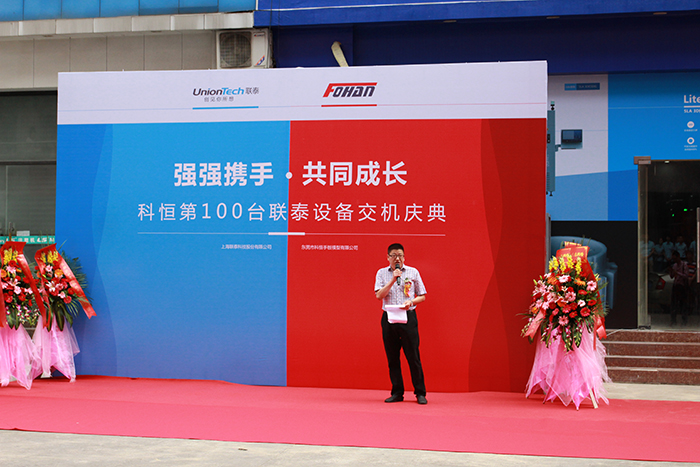 在所有科恒员工及受邀嘉宾的共同见证下,UnionTechng28南宫总经理马劲松先生、副总经理汪超先生和科恒总经理文土养先生等一行一同为新机交接剪彩。在漫天的礼花的同时,UnionTechng28南宫董事长邹波先生将设备交付牌交予科恒董事长文炳华先生。