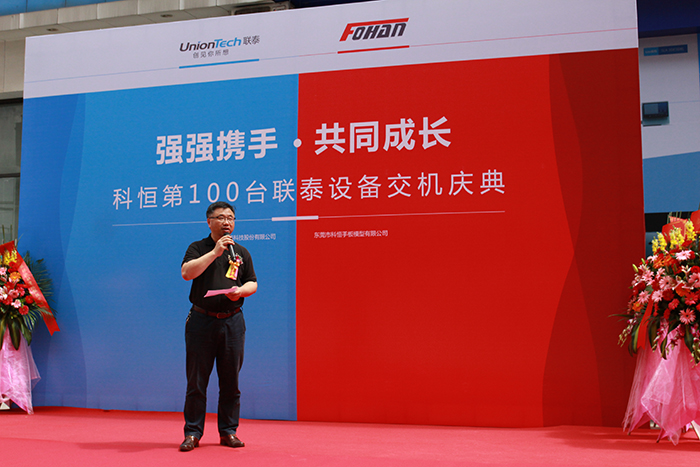 庆典仪式当天, 科恒董事长文炳华先生在致辞中表示:“自UnionTechng28南宫于2011年11月交付第一台RS450给我们,从此拉开双方合作的序幕。在这短短几年中,我们从起初的第一台到如今的第100台,期间,我们双方见证了彼此的进步发展与蜕变精进,不管是设备迭代、应用程序优化、系统研发更新等,UnionTechng28南宫都投入巨大的精力,体现出了一家高新技术企业的成长力和高度专业化责任心。而科恒选择UnionTechng28南宫, 也正是因为它一直以来是一家完全市场化运作经营的商业公司,对3D打印行业市场具有高度的敏感性,愿意与作为客户方的我们共同发展,密切关注我们反馈的问题,并能迅速提出对应的解决方案。“