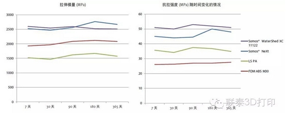 Somos®通过历时一年的观察实验,对 Somos® NeXt 和 Somos® WaterShed XC 11122 与 LS PA 和 FDM ABS 材料的一般物理特性进行了对比。即使在一年以后,Somos® NeXt 和 Somos® WaterShed XC 11122 的性能仍与 FDM 和 LS 不相上下,只是总体拉伸性能略有变化。如今,以前只能考虑使用 3D 打印技术来打印生产件的工程师可以跳出传统思维模式,考虑使用 Somos® NeXt 和 Somos® WaterShed XC 11122 材料以及光固化3D打印技术(其具有可呈现精细细部特征、精度高和光滑表面品质的特点),来实现他们的应用。