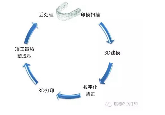 整个隐形牙套的生产流程大致分为“印模-扫描-3D建模-数字化矫正-3D打印牙模-矫正器热塑成型-后处理”几大环节。3D打印在整个流程中,主要承担着批量定制不同矫正阶段牙齿模型的功能。
