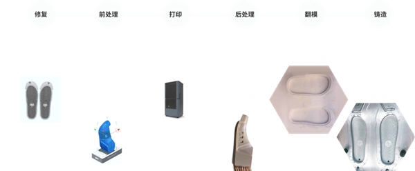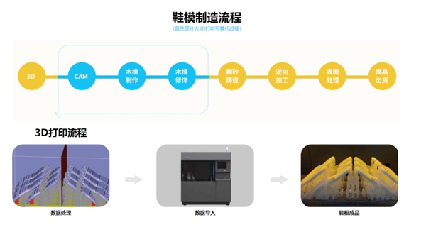 传统制鞋市场,鞋模的制作从设计到一双成品鞋模需要经过编程、CNC、机械加工、修模、试模、咬花等工序,加工工序较复杂,周期长成本高。时尚行业之中,鞋企产品的更新更替对于占据市场竞争都有着至关重要的作用。3D打印在鞋企的应用极大简化了鞋模的生产流程,生产效率得到大幅度提升,也会不断提高着出货和上新的速度。