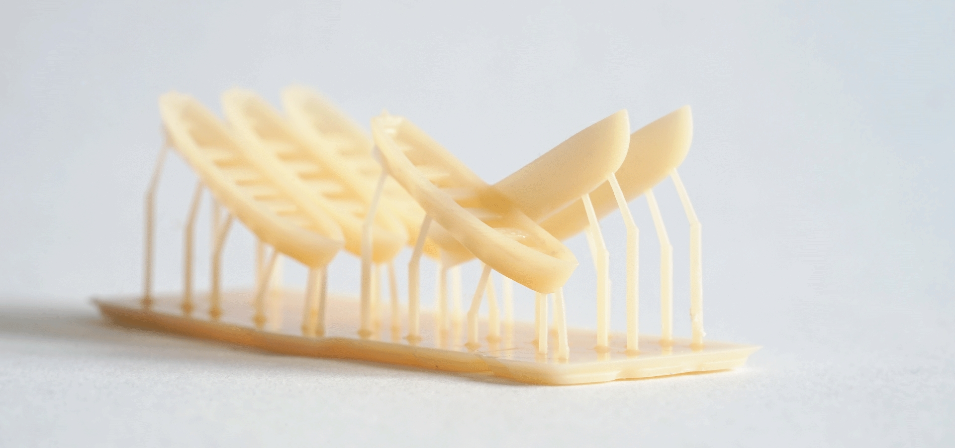 Etech D-FPT是一款适用于上投影DLP的低粘度光固化树脂。成型的制品可水洗或免洗,操作简便环保。用其打印的样件耐温高,热变形温度75℃。同时,使用本产品打印的样件表面细腻、细节还原度高,可用于打印正畸牙模、夹治具等有耐温需求的制品。